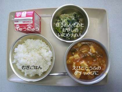 今日の献立は,『えびと豆腐のケチャップ煮』『ほうれん草ともやしの炒めナムル』『麦ごはん』『牛乳』です。