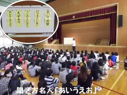 最初に話の聞き方「聞き方名人あいうえお」を確認し,校長先生のお話を聞きました。