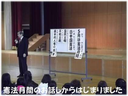「5月は憲法月間,身近なきまりを見つめ直そう!」「友だちに思いやりを持って温かい心で接しよう」という二つのお話でした。