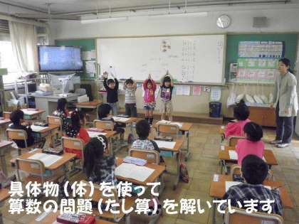 算数でも,たし算の問題を,子どもたちが前に出て,目で見て答えを出せる工夫をしています。