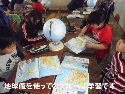 今日は,社会の地形の学習で,地球儀を使っての授業でした。