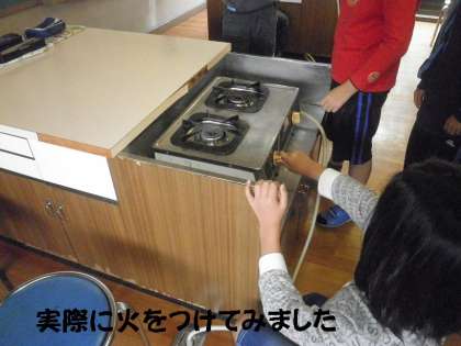 実際に一人一人,コックをひねって火をつける練習もしました。怖々している子どもたちもいましたが,全員,火をつけることができました。