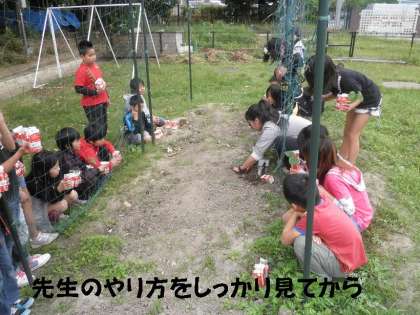 先生のやり方をよく見て,一人一人がていねいに苗植えをしました。昨年の4年生に負けないぐらい,大きなゴーヤやヘチマが育つよう祈ります。