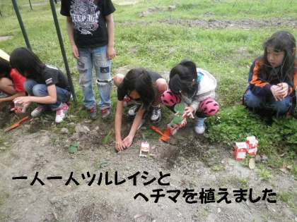 午後から,学習園に行って,先月から牛乳パックで育てていた「ツルレイシ(ゴーヤ)」と「ヘチマ」を畑に植えました。