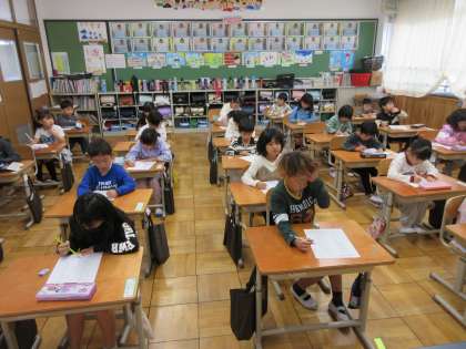 1年生は、「くり上がりのあるたしざん」のカードを使って友だちと問題を出し合っています。