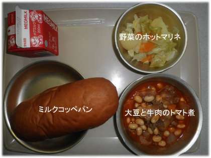 「ミルクコッペパン」「大豆と牛肉のトマト煮」「野菜のホットマリネ」