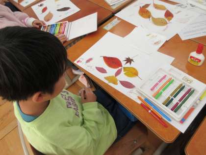 先週に森で描いたスケッチや、拾ってきた落ち葉を使って、「あきいっぱいアート」を楽しくつくりました。