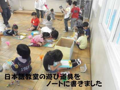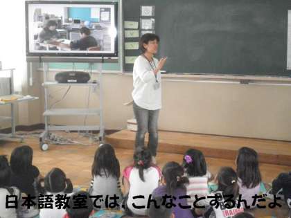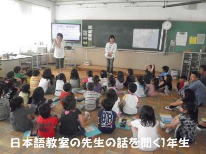 午後から,1年生全員で,日本語教室を訪問しました。そして,日本語教室の先生から,日本語教室ってこんなことするんだよ!と教えてもらいました。中国や韓国をはじめ,世界の国の本やゲーム,遊び道具も見せてもらい,熱心にノートに書き込んでいました。
