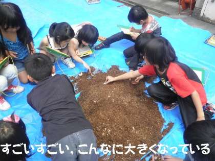 幼虫が予想よりはるかに大きく成長していて,子どもたちは歓声をあげていました。