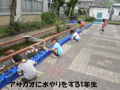 朝,登校してきた1年生は,自分のアサガオに水をあげています。