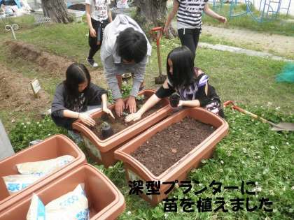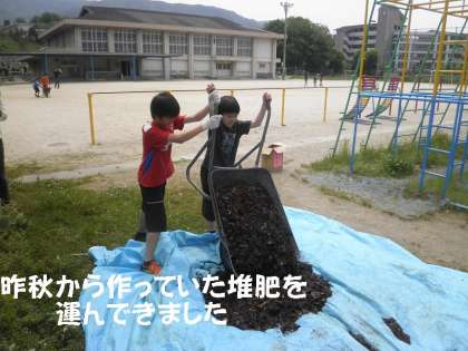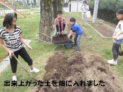 よく肥えた土を畑に追加し,準備が整いました。発芽して二葉がでている「キュウリ」については,さっそくプランターを使って植えました。