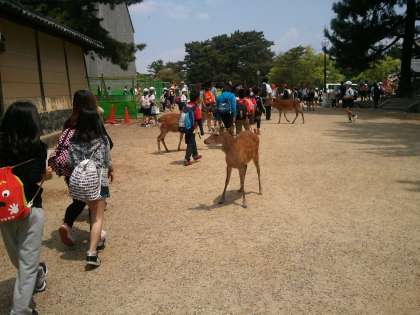 でも,子どもたちは,興福寺の五重の塔より,鹿に興味津々です!?