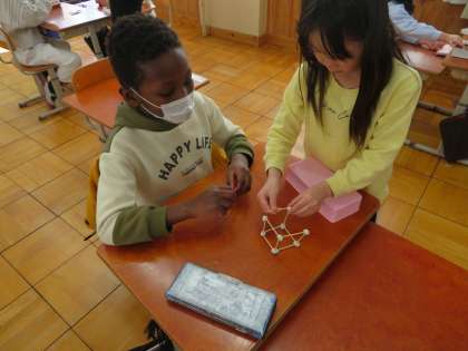 ひごの数や、ねん土玉の数に気を付けながら、ペアで協力して作っていました。