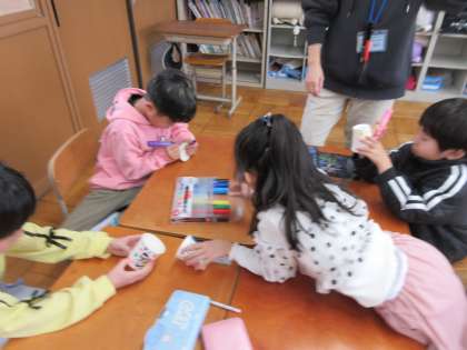 キャンドルを灯すためのコップに、願い事を書いた子どもたち。