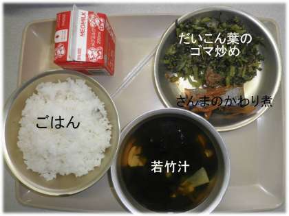 「ごはん」「若竹汁」「さんまのかわり煮」「だいこん葉のゴマ炒め」