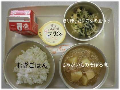 「むぎごはん」「じゃがいものそぼろ煮」「きりぼしだいこんの煮つけ」「プリン」