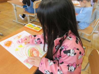 今日は初めての図工で、クレパスをつかって「おひさま」をかきました。