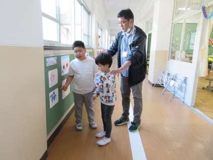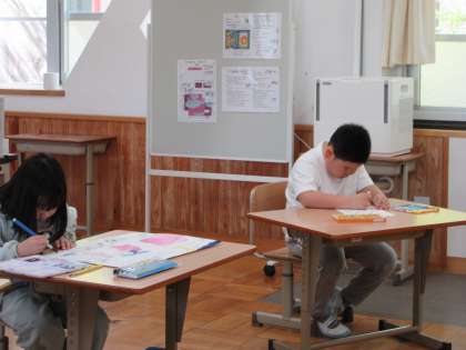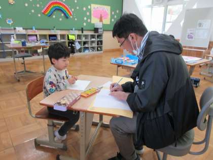 図工の作品が掲示してあるのを見ながら、楽しくお話をしたり、1日の予定を確かめたりしていました。