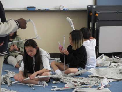 新聞紙を使って工夫をしながら、友だちと家などをつくりました。