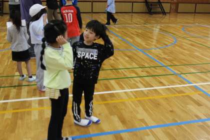 1年生が手作りのメダルをもらったり,仲間集めゲームをしたり,