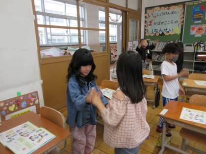 歌を楽しく歌ったあとは、「セブンステップス」を歌いながら友だちと体を動かしました。