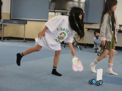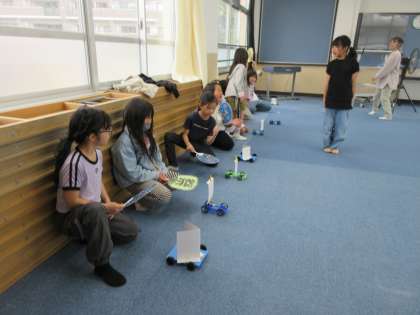 「ものを動かす」ということを利用して風で動く車を走らせました。