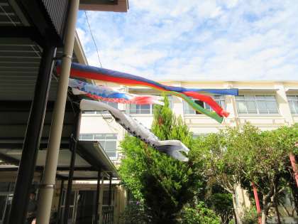 学校の「こいのぼり」も、子どもたちの健康と安全を願って、風になびきながら元気に泳いでいました!