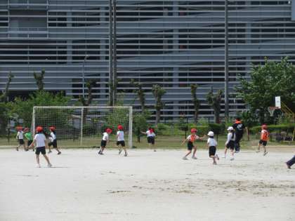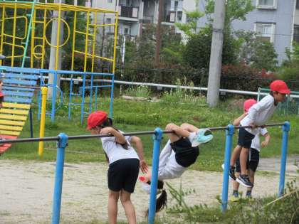 2年生は、おにごっこを楽しんだ後、鉄棒のいろいろな技に挑戦していました。