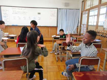 英語を使って、友だちと尋ね合っていました。