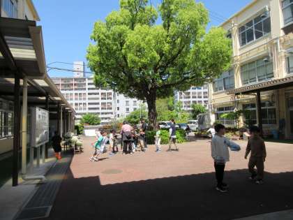 出来上がった作品を持って中庭へ!