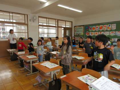 1年生は、友だちと「セブンステップス」を歌いながら踊った後、「たん」のリズムを使って、いろいろな活動をしました。