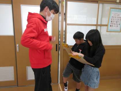 4年生は、「先生たちが小学生の頃に夢中になっていたことは何ですか?」とインタビューをして、答えてもらったことをメモに書く学習をしています。