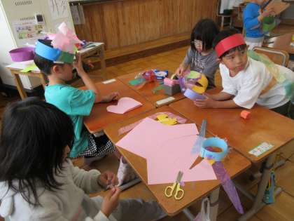 紙やすずらんテープなどを使って、輪っかをつくり、かぶったり体に纏ったりして楽しんでいました。