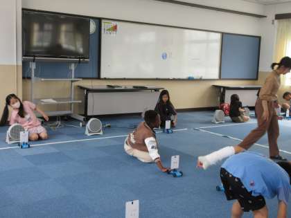 風で動く車を、風力を変えて走らせています。