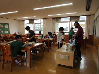 栄養バランスの学習の後は、ランチルームでの給食です。