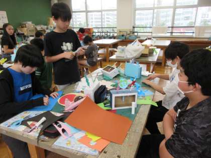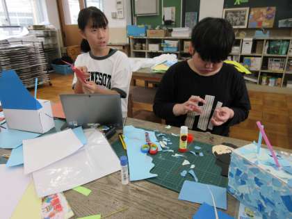 先週作ったクランクの仕組みを使って、アイデアいっぱいの作品を作り進めていました。