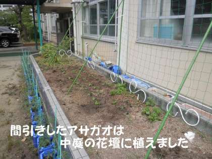 抜いた2本は,中庭の花壇に植えかえました。緑のカーテン用のネットもはって,夏は日蔭作りに役立てたいと思います。