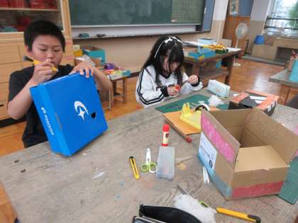 「のぞいてみると」の学習で、箱にキリで穴をたくさんあけて、のぞいて楽しむ作品を作っています。