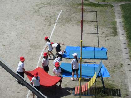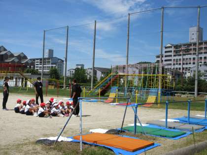 安心して技に挑戦できるように、鉄棒の下にマットを敷いて安全対策をしています。
