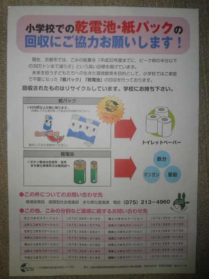 これまでの牛乳パック同様,ご家庭でいらなくなった「乾電池」がありましたら,学校の回収ボックスに持ってきていただけたらありがたいです。よろしくご協力をお願いします。