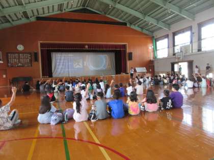 夏休みの自由研究に向けて、校長先生が子どもたちの前で実験をしてくださいました。