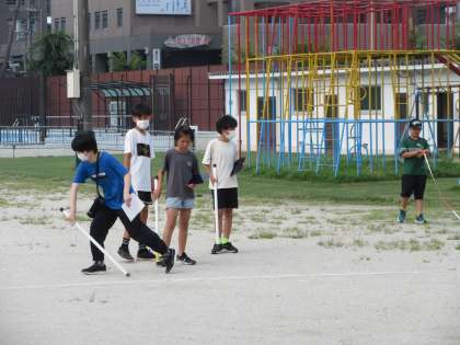 棒で何かを描いたり、先生もラインを引いたりしています。