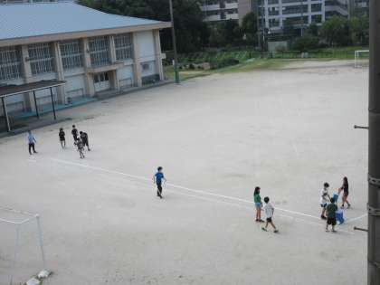 朝一番、6年生のみんなが、運動場で何かをしています。