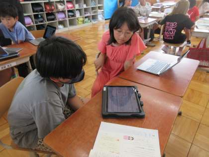 ペアで報告する文章を読んで質問や意見のやりとりをしました。