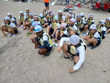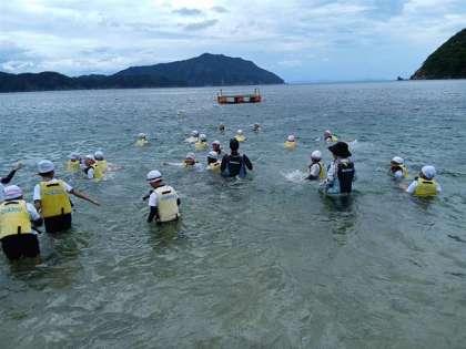 午後の活動は水泳です。目の前に広がる壮大な若狭湾に、子どもたちは大興奮。海水で泳ぐのは初めてという子も多く、ものめずらしさに目を輝かせていました。