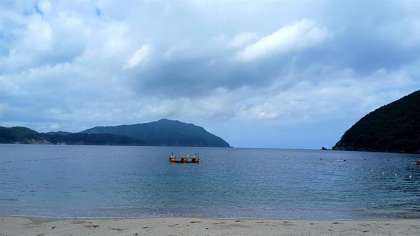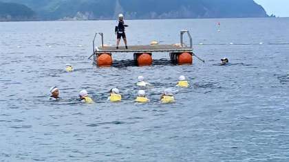 絶好の海水浴日和で、青空の下、子どもたちは元気いっぱいに海とふれあっています。