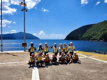 澄み渡る青空ときらめく海を背景に、子どもたちが並んで記念撮影。海辺の風が心地よく、みんなの表情も晴れやかです。楽しい思い出がまたひとつ増えました。