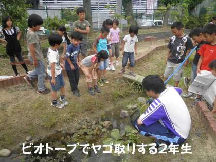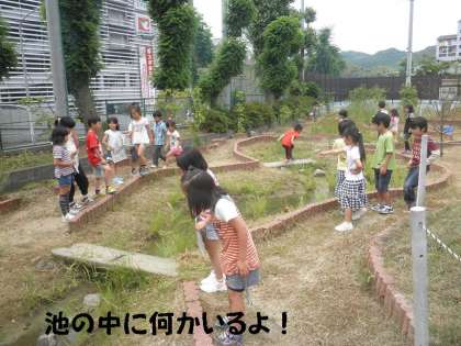 今日は,みんなでビオトープに行って「ヤゴ」とりをしました。生活科でヤゴを観察して,トンボになるまで育てます。