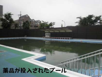 水泳学習を間近かに控えて,今日,プールに藻を除去する薬品を投入してもらいました。
