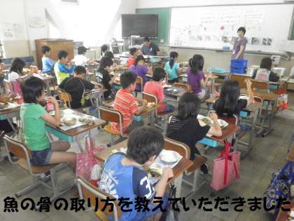今日の給食時間に,栄養教諭の北山先生に,魚の骨の取り方を習いました。